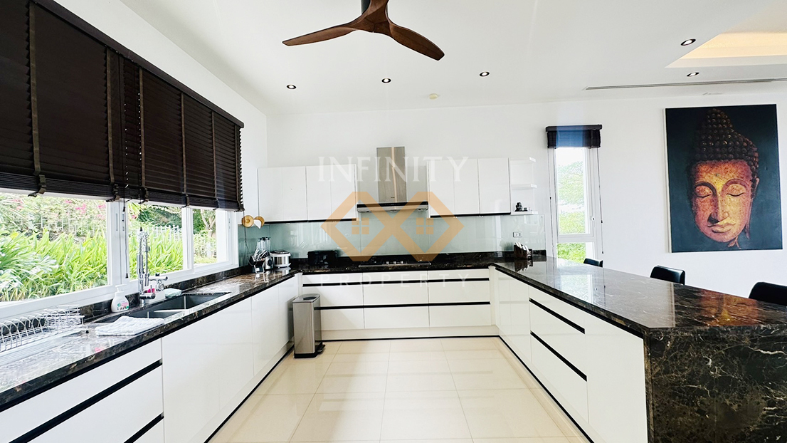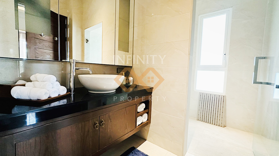 below. Comprised of two levels as well as a service floor, the villa includes 4 en-suite bedrooms, a fully equipped European kitchen,